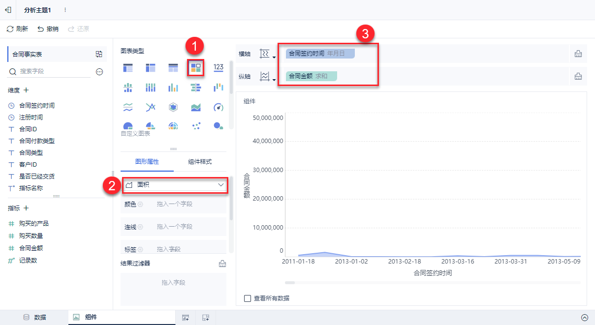 面积图可用来展示持续性数据,可很好地表示趋势、累积、减少以及变化等。例如,展示「合同金额」随日期的变化。如下图所示: