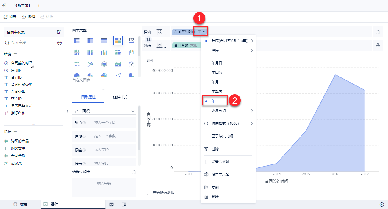 3)如果想看「合同金额」随「年」变化,操作如下图所示: