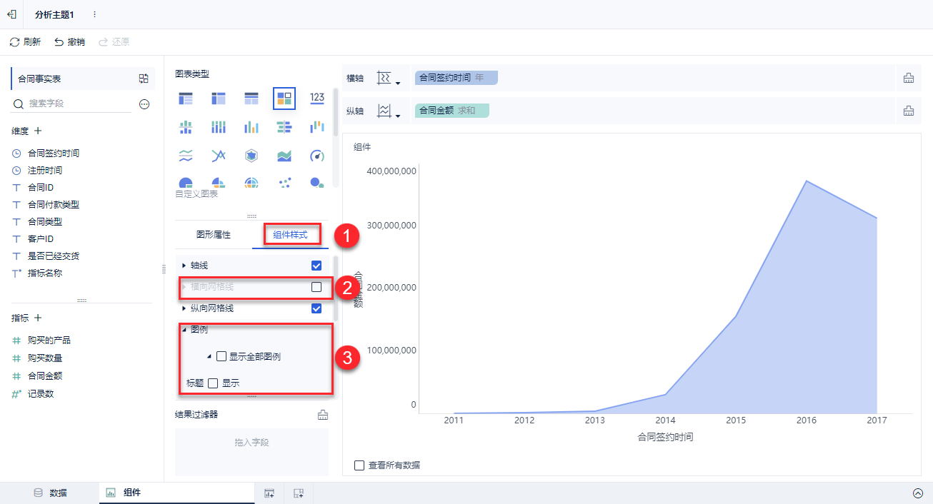 例如,组件样式中取消显示「图例」和「横向网格线」。如下图所示: