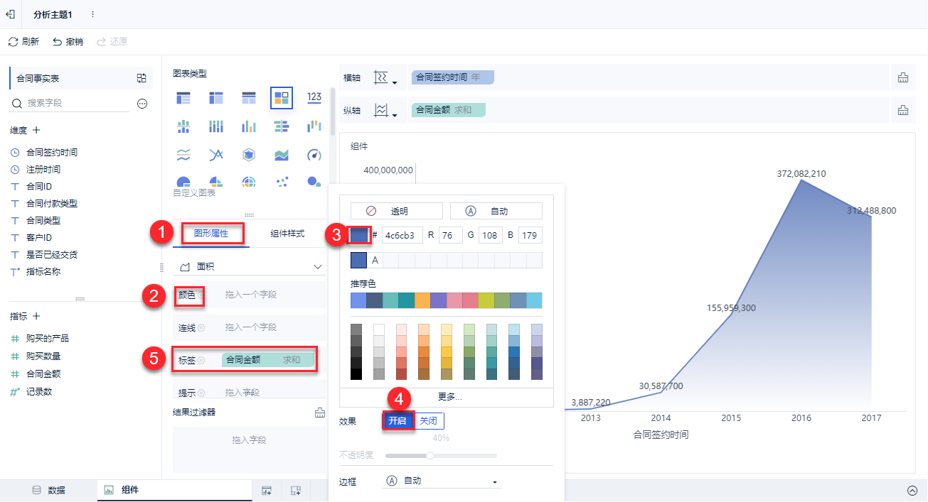 将「颜色」内字段移除,设置图形为「蓝色」,开启渐变「效果」,并拖入「合同金额」作为标签。如下图所示: