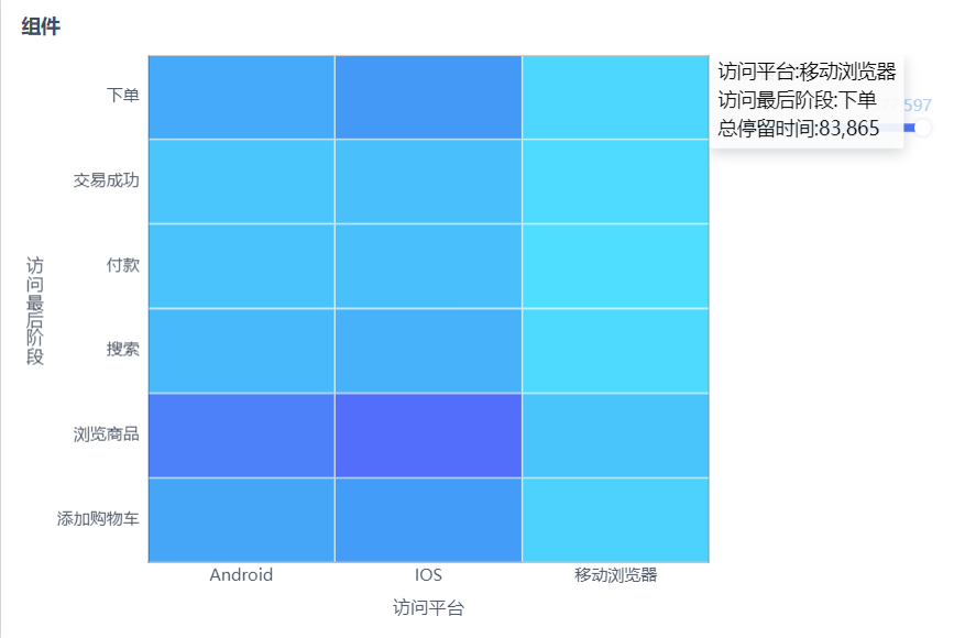 矩形块图以矩形块的形式展示不同数据点的分布情况,矩形块图可以通过颜色或矩形块的大小来展示对应指标值的大小。例如,展示不同访问平台、访问阶段的访问时间分布,访问时间约长,颜色越深。如下图所示: