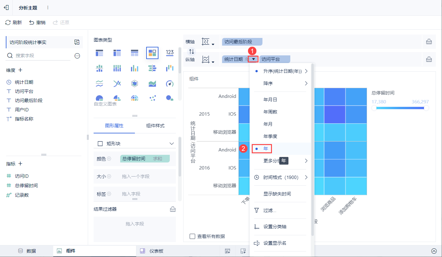 2)此时图表预览处即出现矩形块的显示,但该矩形块未显示分布在访问阶段和平台的访问时间,因此,我们将指标下的「总停留时间」字段拖入「图形属性」中的「颜色」下,表示图表中的颜色根据访问的停留时间显示。如下图所示: