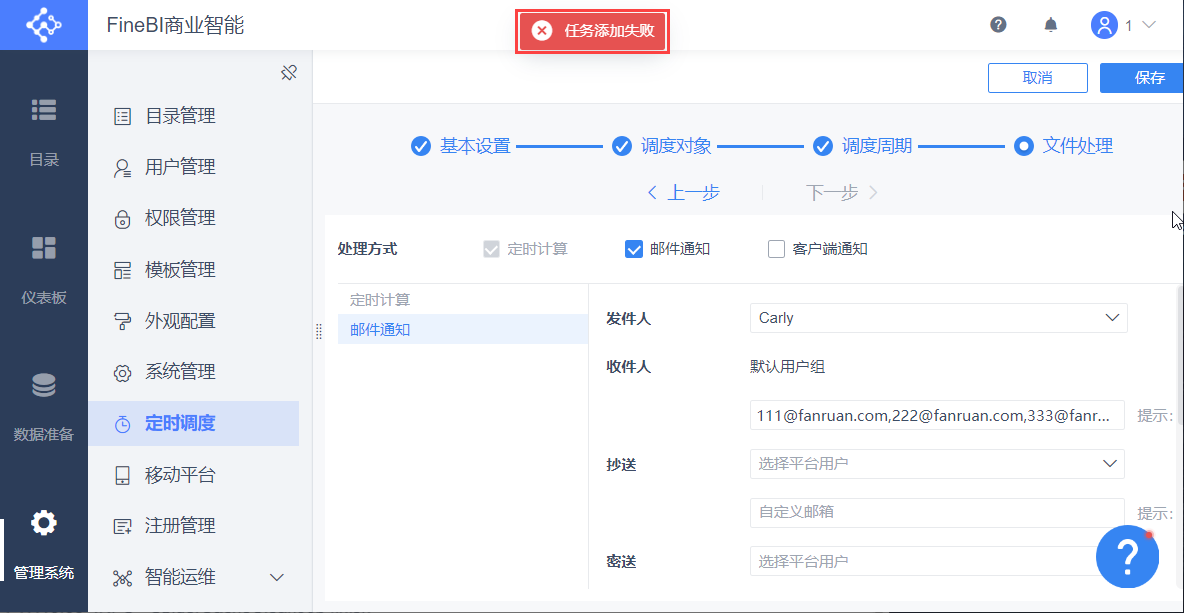 解析的邮箱地址(例如使用公式输入),输入的字符长度不受FineBI限制,可以保存任务。但可能会因为邮箱服务器限制等环境因素,导致任务执行失败。