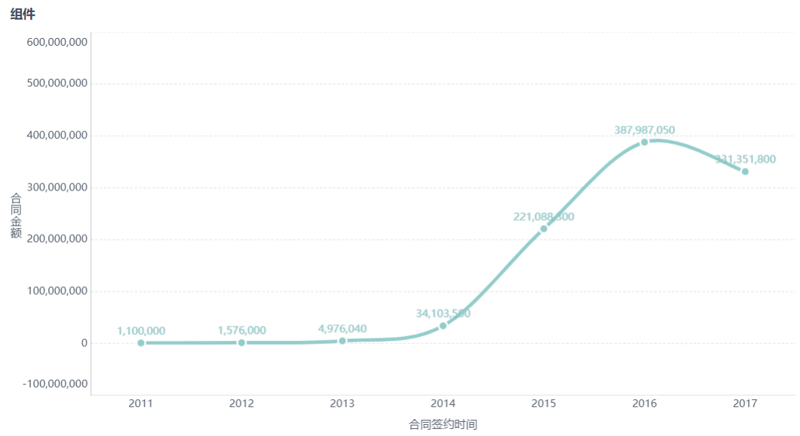 3)鼠标悬浮在横轴中的「合同签约时间」字段上,点击「倒三角>年」,展示不同年份合同金额的变化趋势。如下图所示: