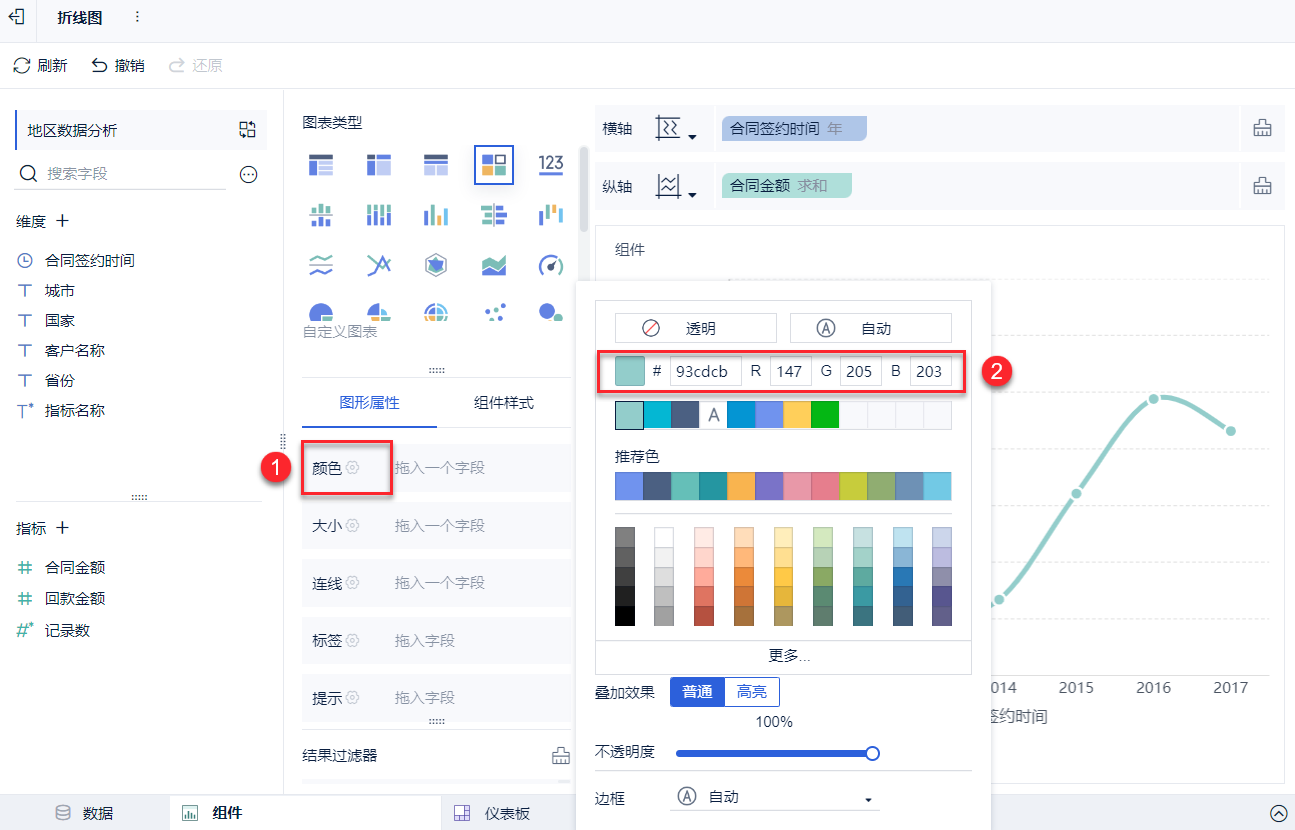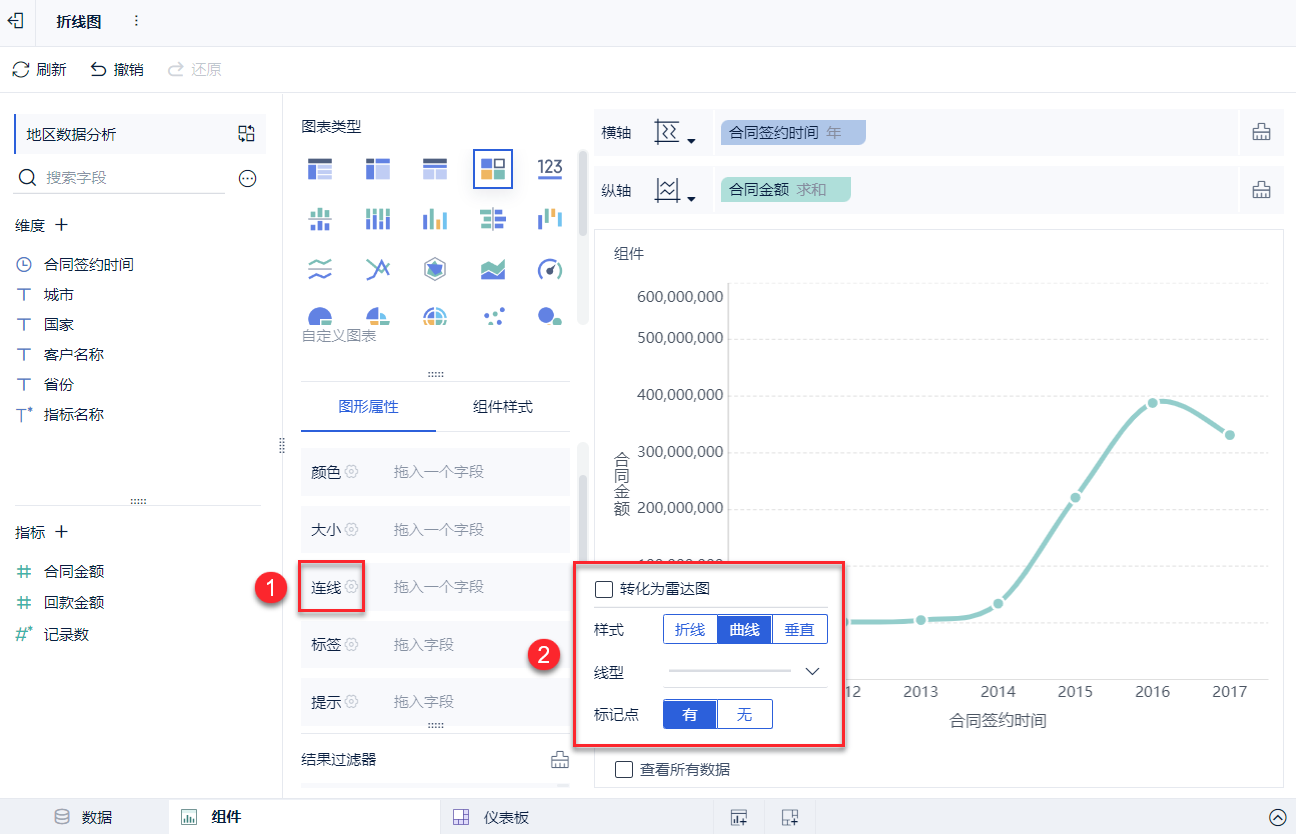 2)在图表类型下点击「自定义图表」,图形属性下选择「线」。将「合同签约时间」字段拖入横轴,「合同金额」字段拖入纵轴。如下图所示:
