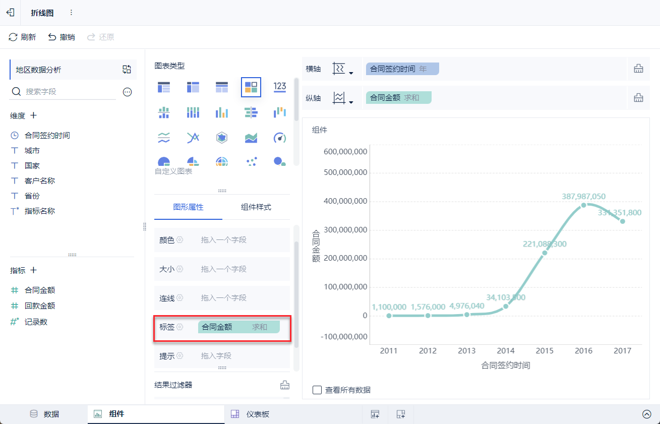 将「合同金额」字段拖入到标签栏,设置标签。如下图所示: