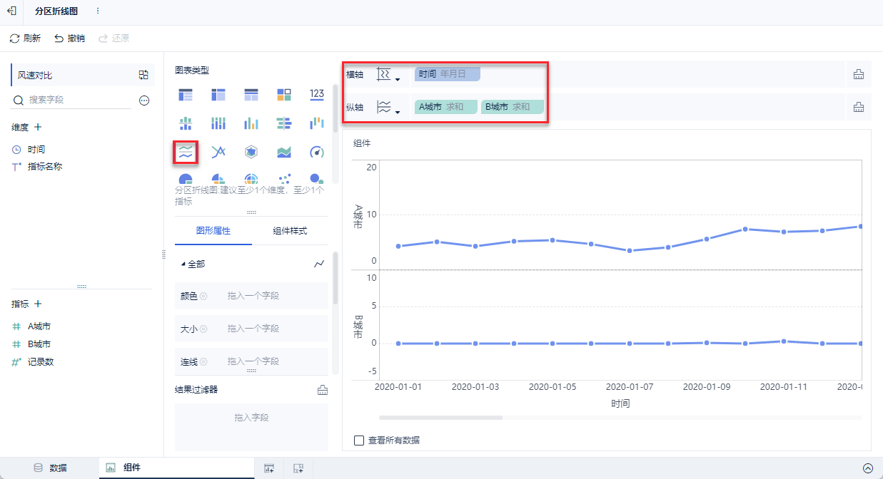 2)在图表类型下选择「分区折线图」将「时间」字段拖入到横轴中,「A城市」、「B城市」字段拖入到纵轴中。如下图所示: