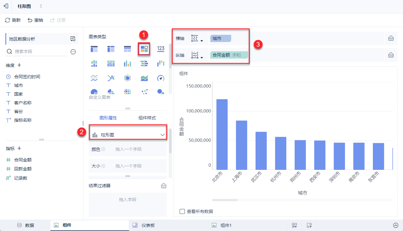 2)在图表类型下选择「自定义图表」,图形属性下选择「柱形图」。将「省份」字段拖入横轴,「合同金额」字段拖入纵轴。如下图所示: