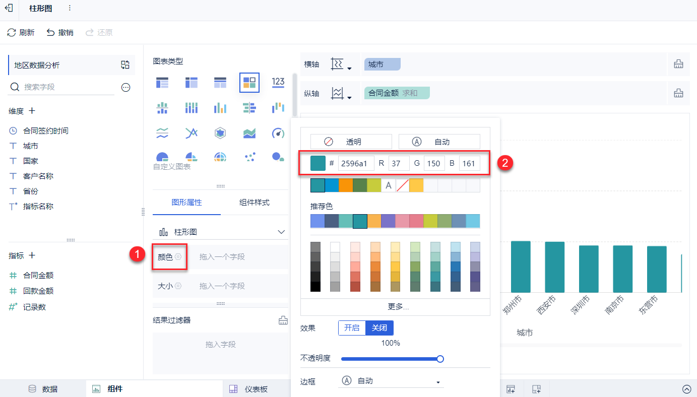 点击「颜色」栏,可设置柱形图颜色。如下图所示: