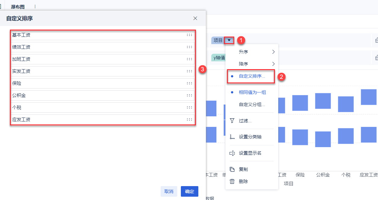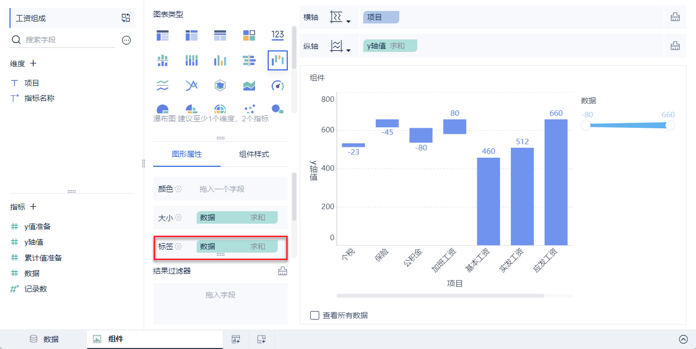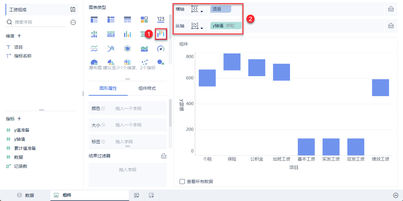 1)在图表类型下选择「瀑布图」,将「项目」字段拖入到维度中,「y轴值」、「数据」字段拖入到指标中,在图表类型下点击「瀑布图」。如下图所示: