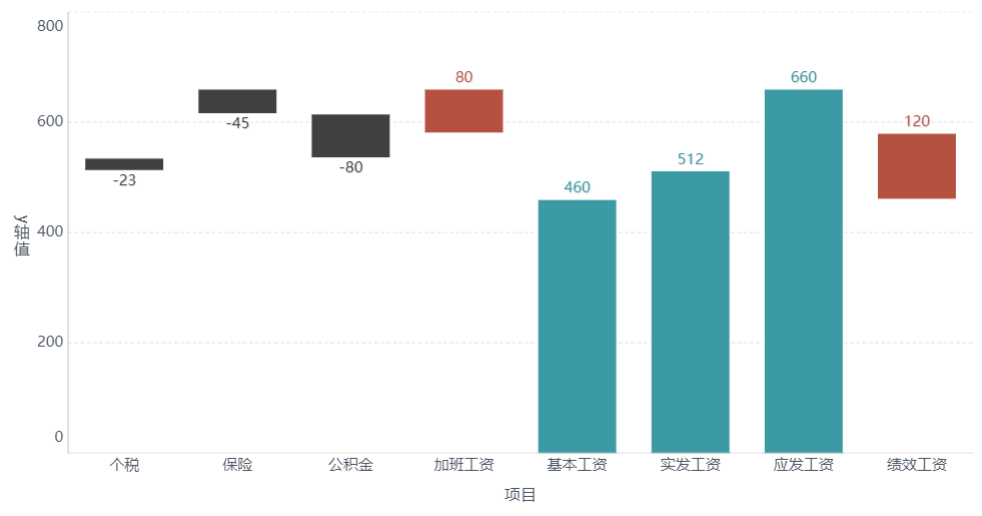 瀑布图采用绝对值与相对值结合的方式,来表达数个特定数值之间的数量变化关系。这种效果的图形能够在反映数据多少的同时,直观反映出数据的增减变化过程。