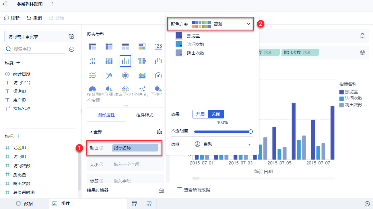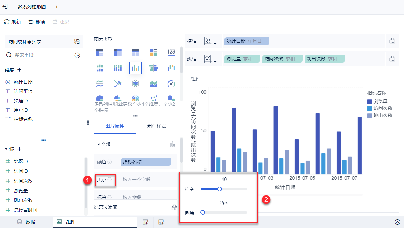 2)选择「多系列柱形图」,将待分析区域维度下的字段「统计日期」拖入横轴中,将指标下的字段「浏览量」、「访问次数」、「跳出次数」拖入纵轴中,如下图所示: