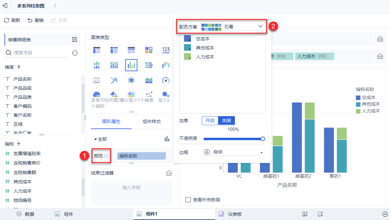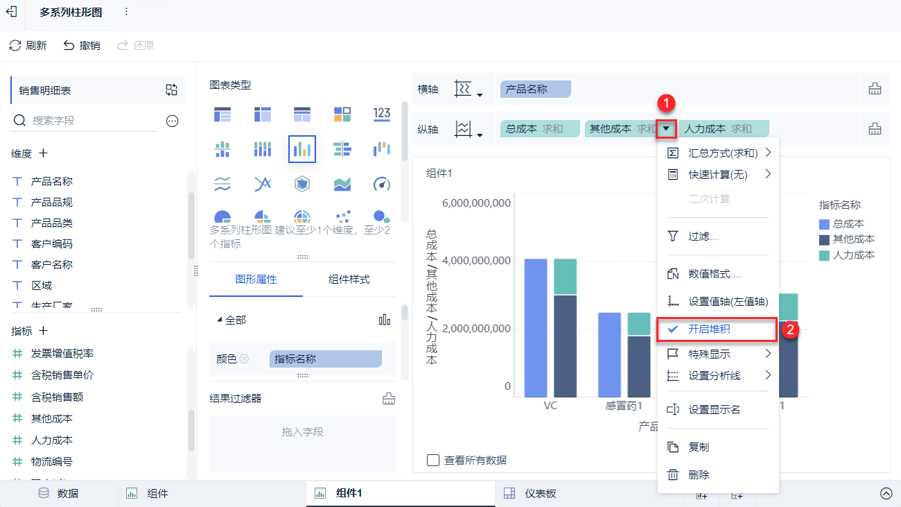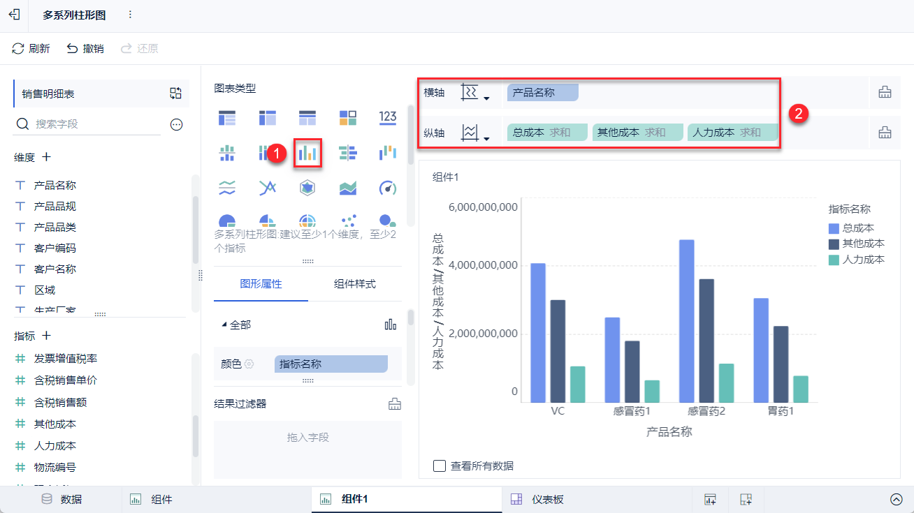 注:该多系列柱形图必须在横纵轴中有大于等于1个维度、大于等于2个指标字段才能选择,否则图表类型下的多系列柱形图将灰化无法点击。