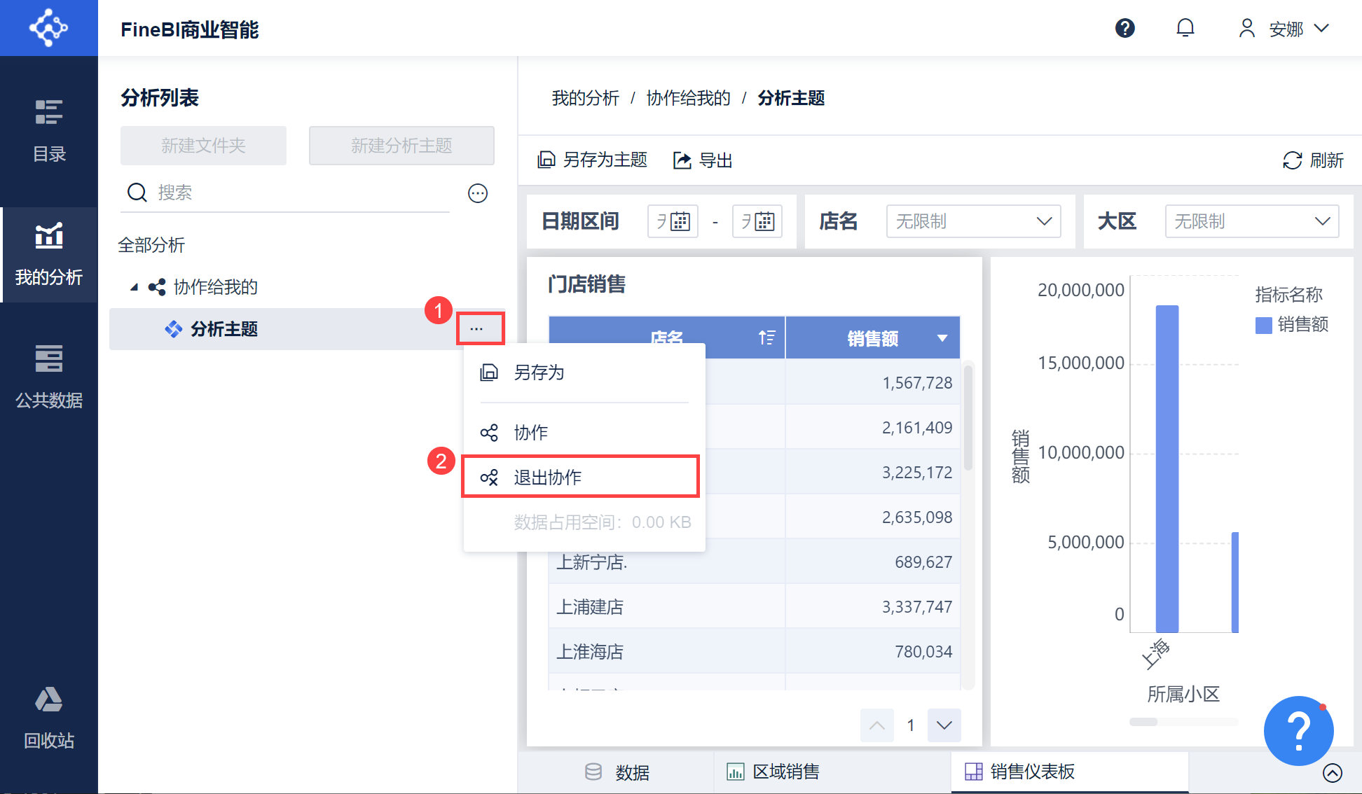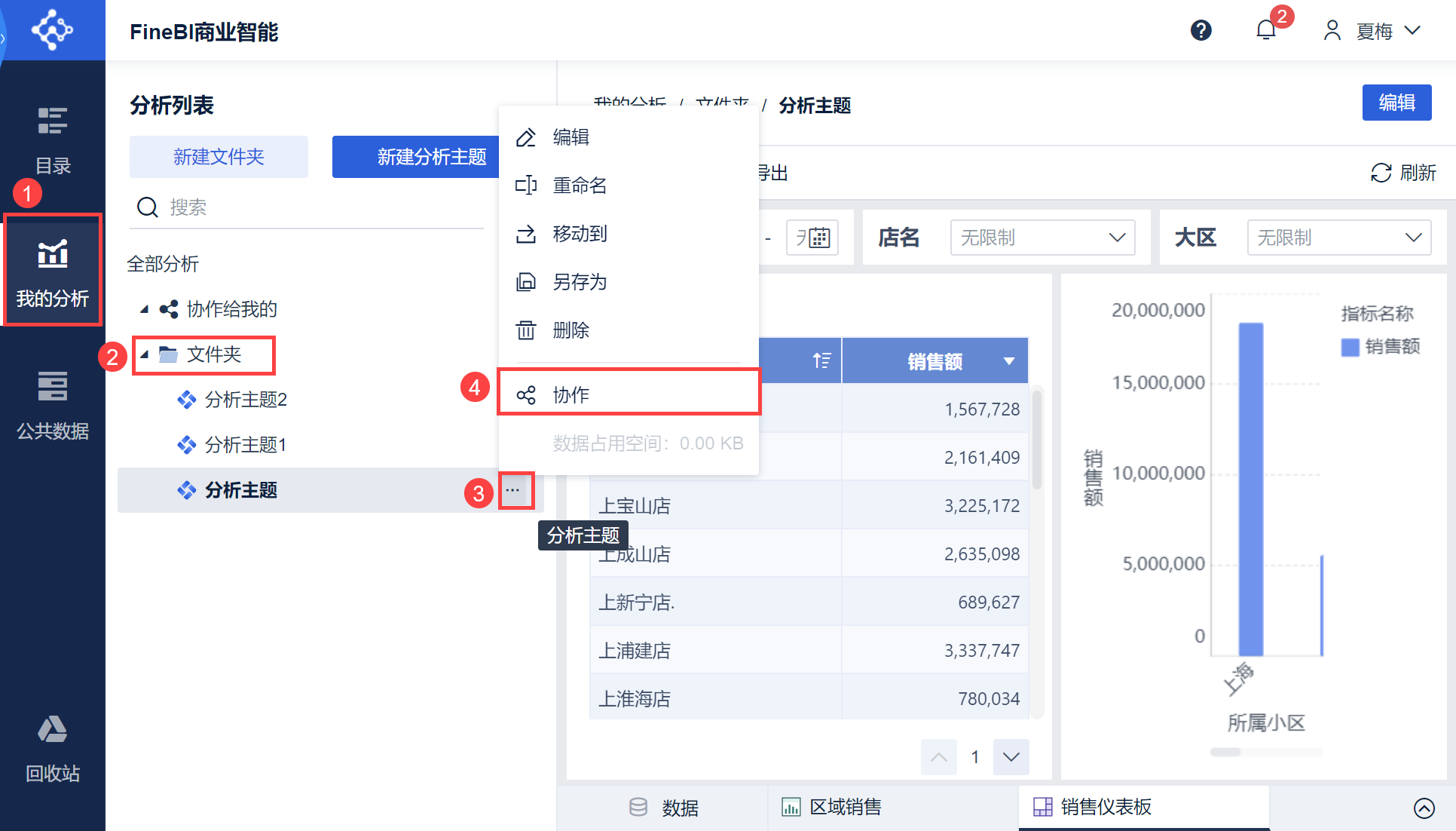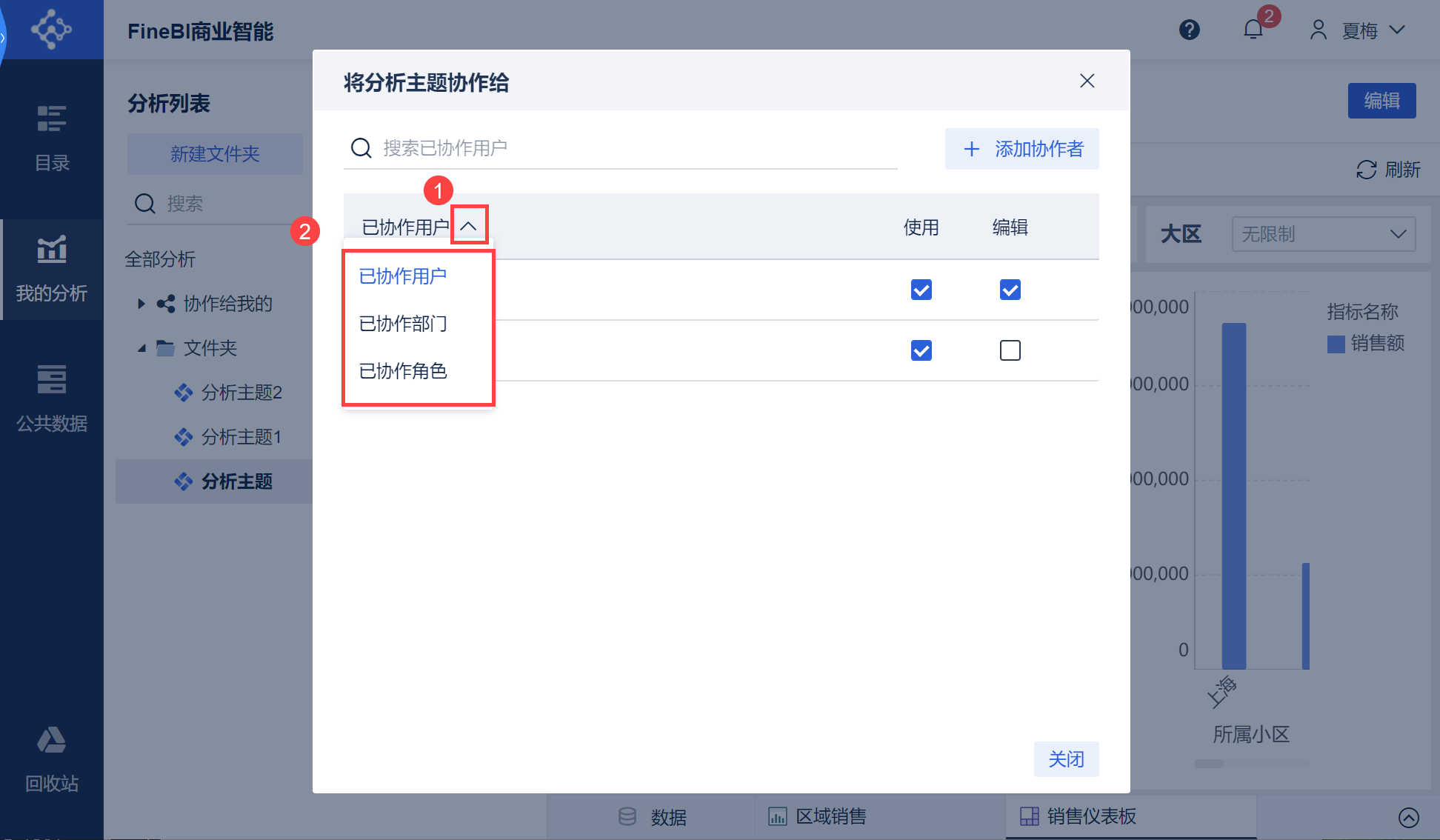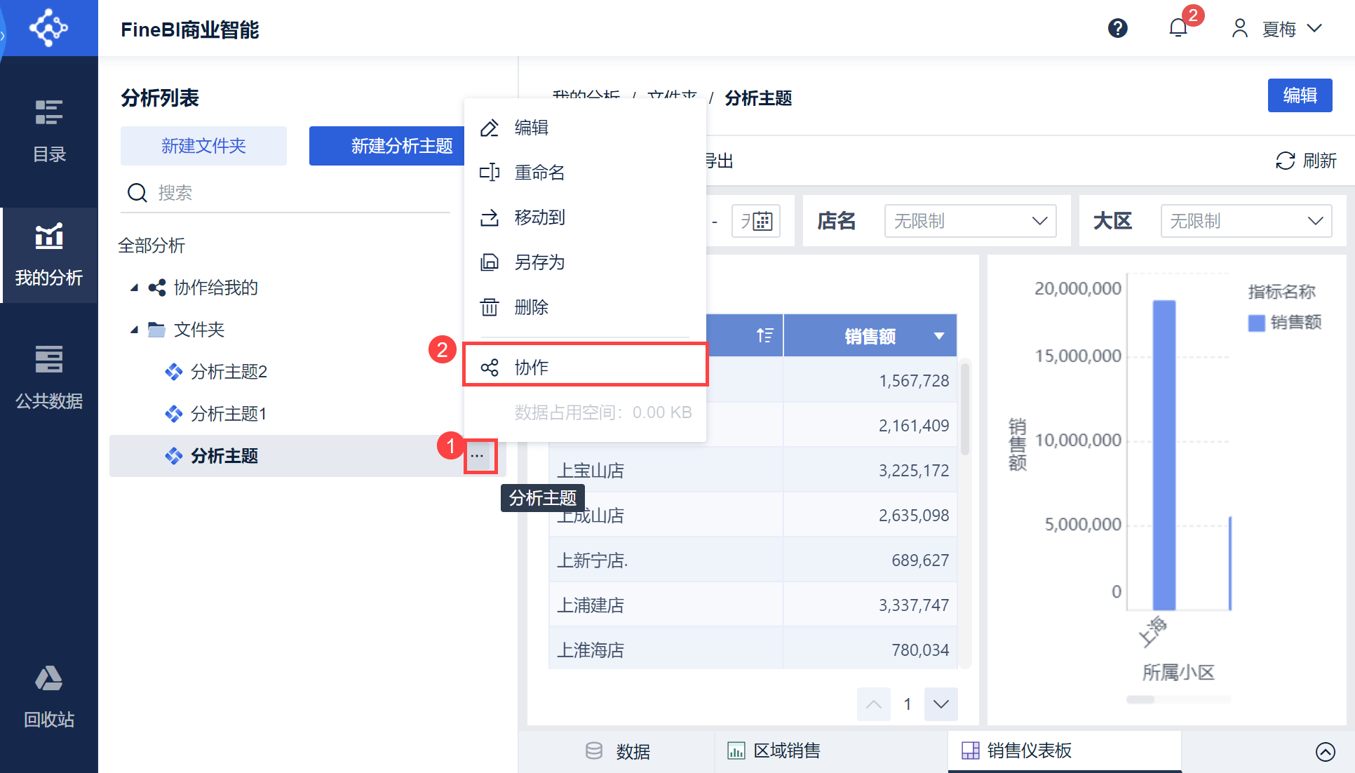 1)设计用户夏梅进入「我的分析」下的分析列表中,选择需要分享的主题,点击「...>协作」,如下图所示: