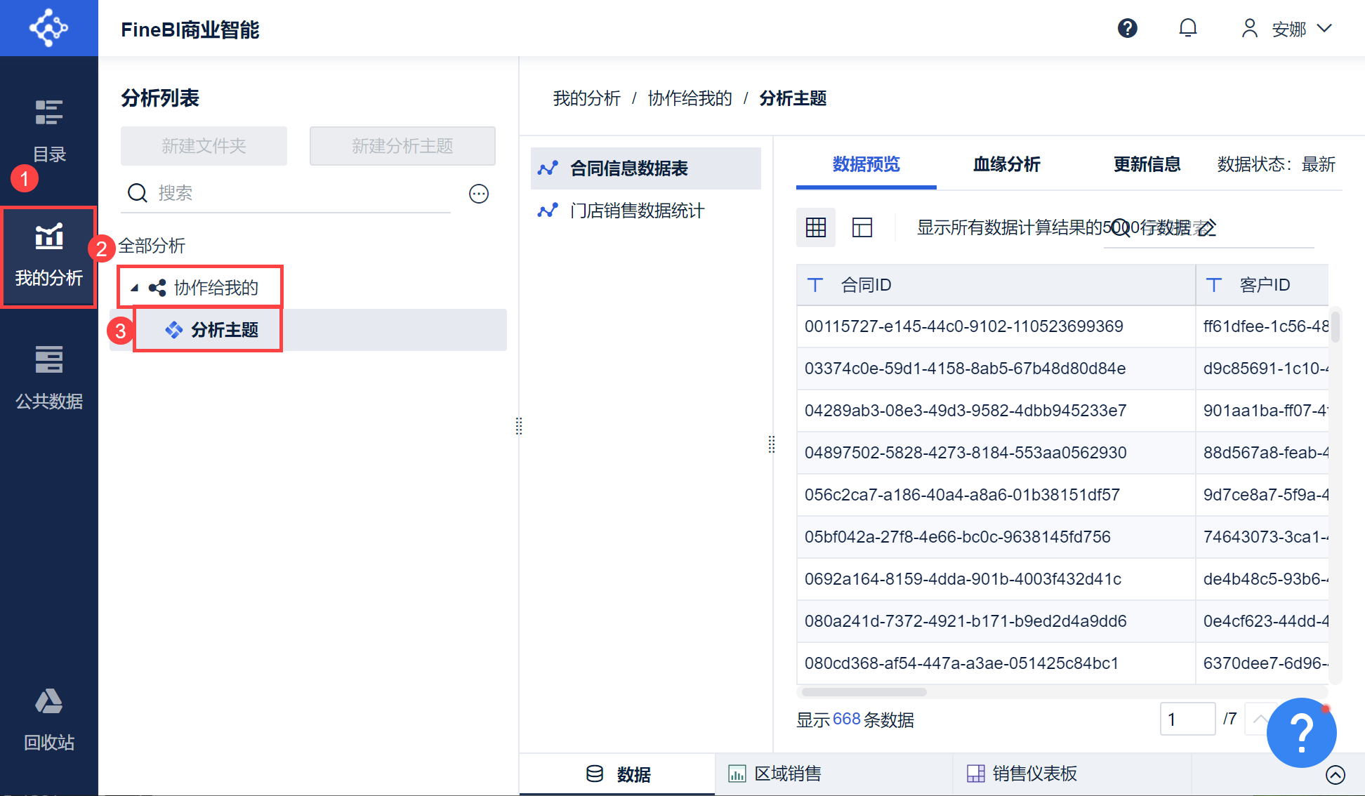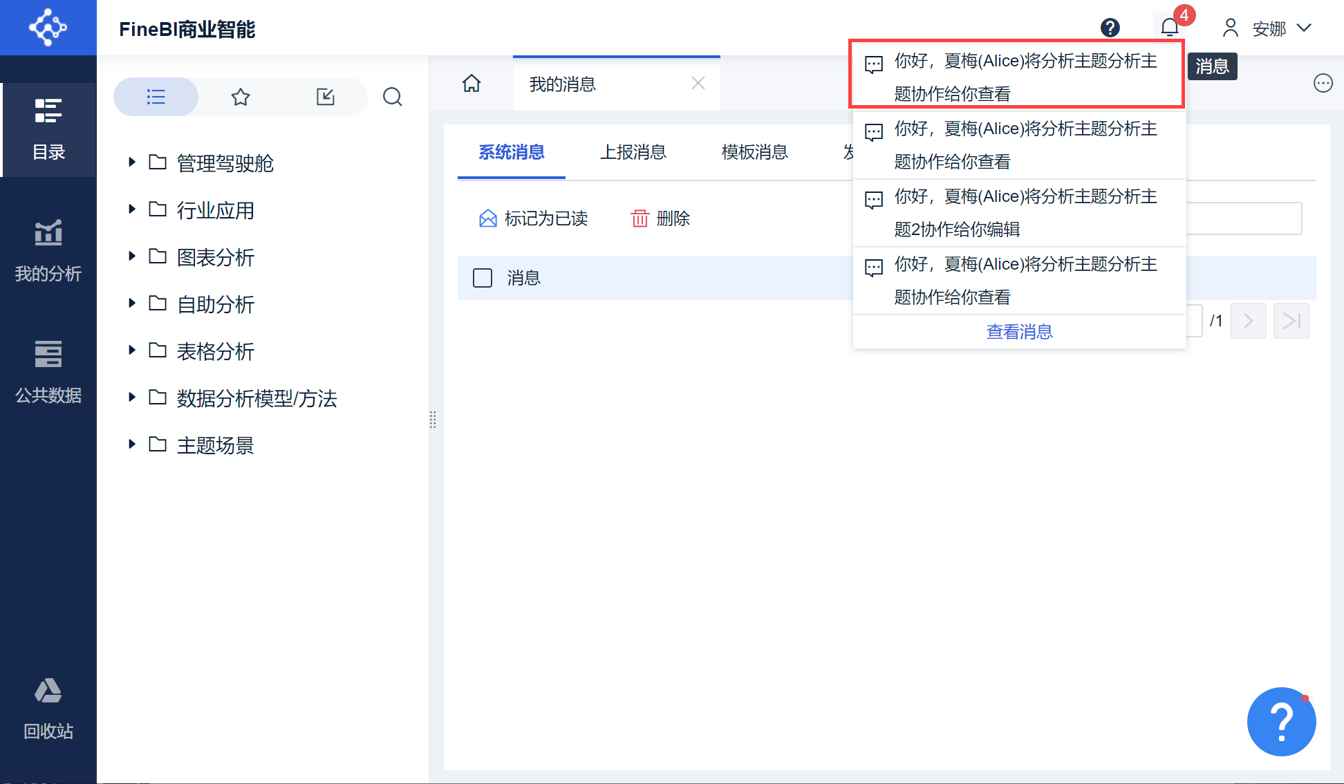 Anna 登录账号,可以看到消息提示,同时进入「我的分析>协作给我的」下,可以看到 Alice 分享给他的分析主题,如下图所示: