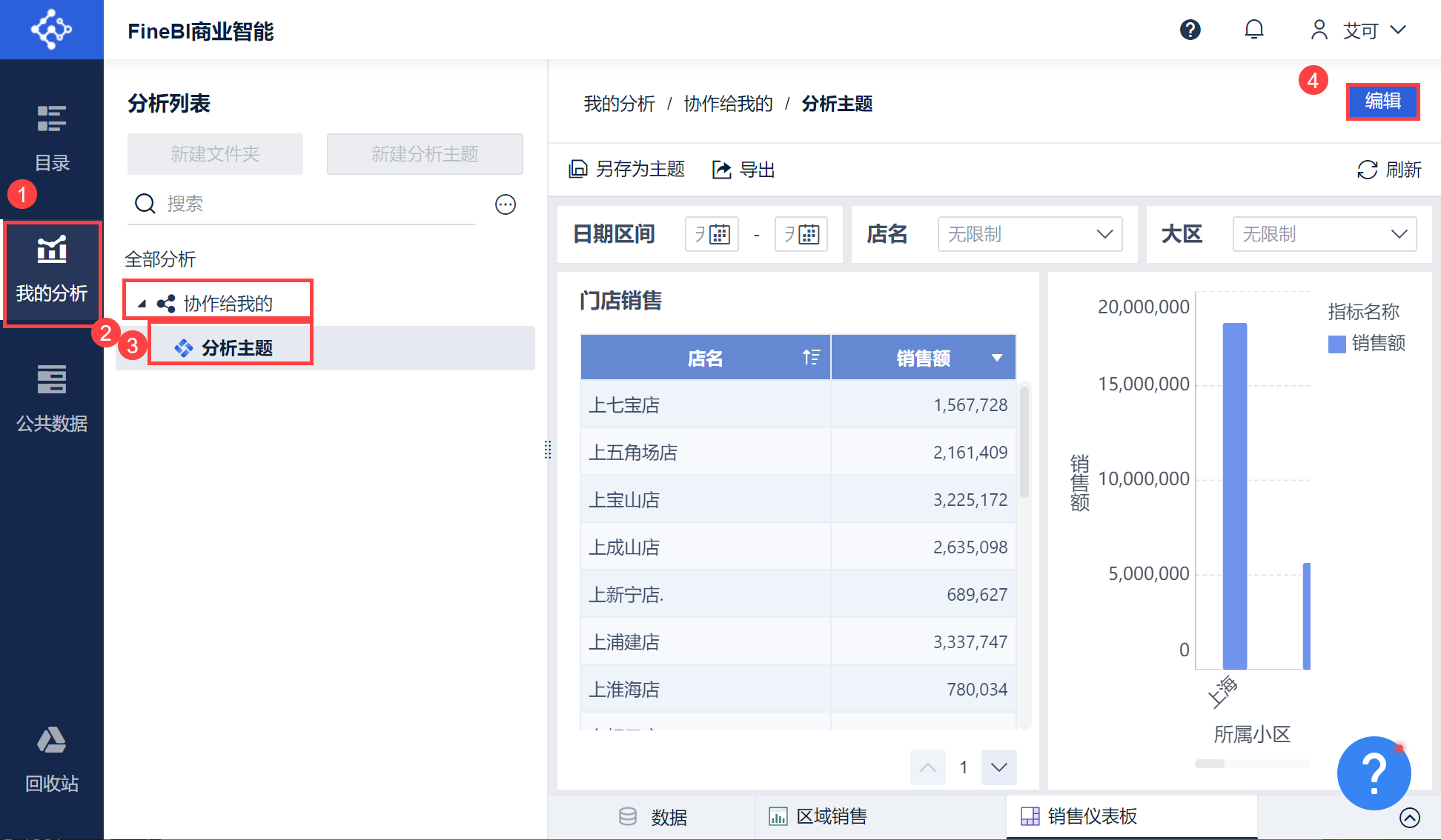eoco 登录账号,进入「我的分析>协作给我的」下,可以看到 Alice 分享给他的分析主题,同时可以点击右上角的编辑按钮编辑分析主题,如下图所示: