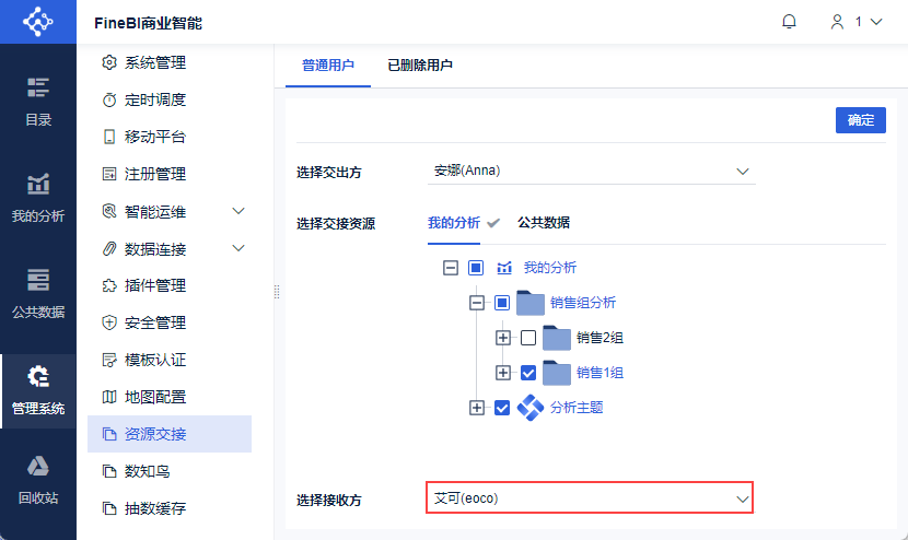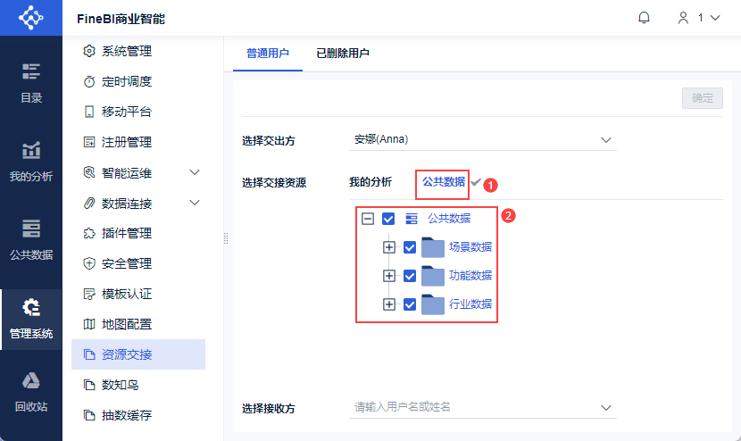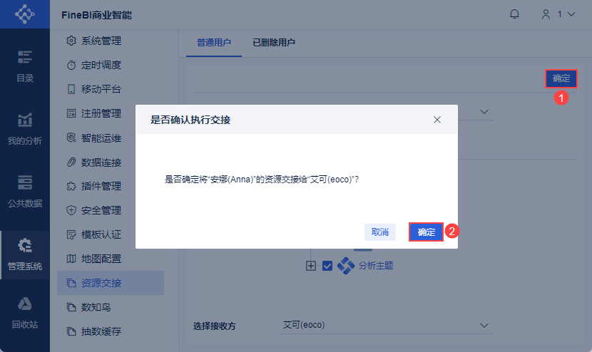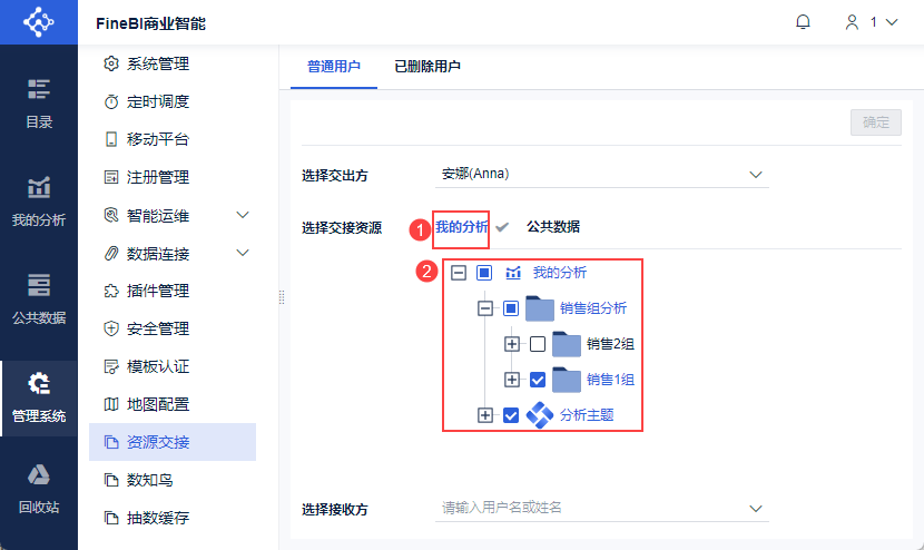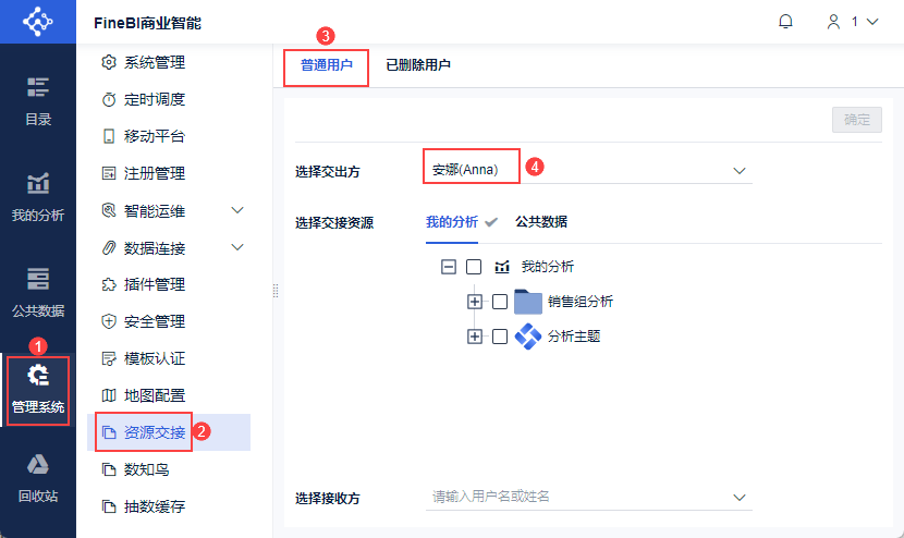 超管登录FineBI系统,选择「管理系统>资源交接」,选择「普通用户」,选择交出方为 Anna 用户,如下图所示: