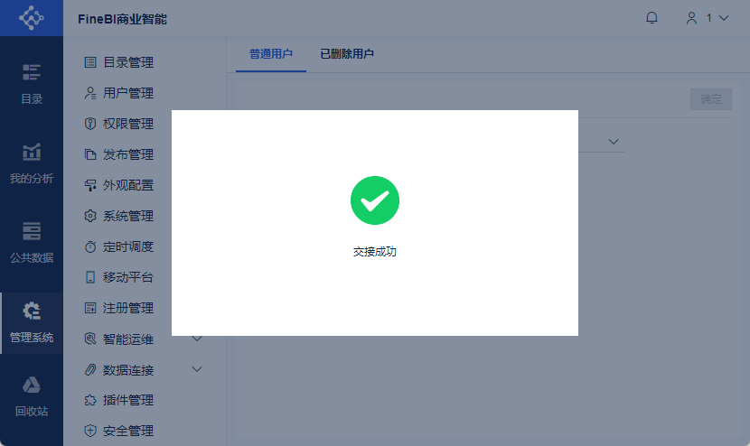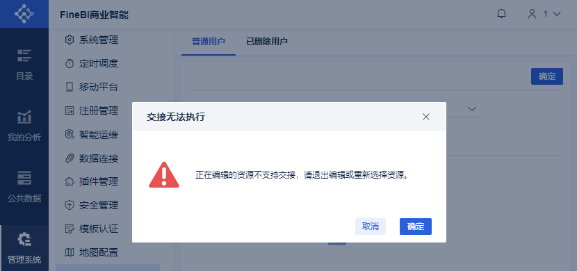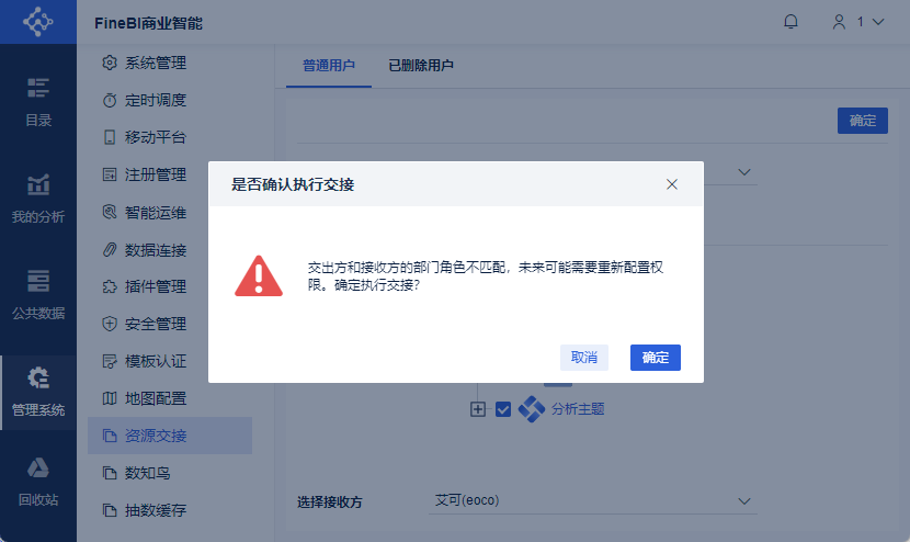 普通用户资源交接是指该用户没有从用户管理中删除时,管理员将该用户制作的部分或者全部仪表板和数据集交接给其他用户使用。