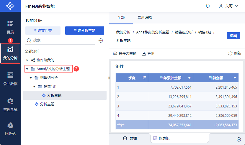 接收方用户eoco(eoco,1)登录FineBI系统,点击「我的分析」,新增文件夹「Anna移交的分析主题」,文件夹内为本次交接到Anna的所有资源,如下图所示: