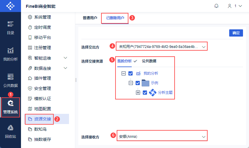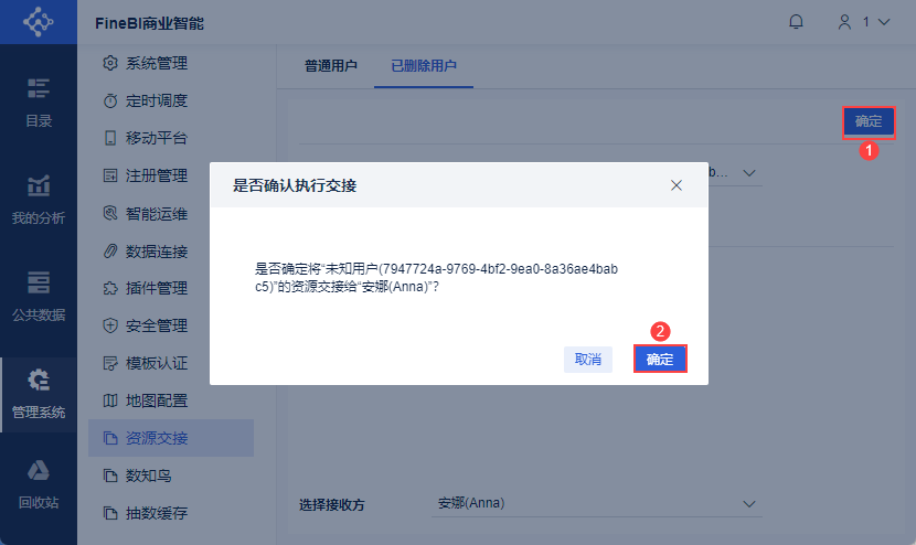 2)点击「确定」,弹出对话框「是否确定将“未知用户(7947724a-9769-4bf2-9ea0-8a36ae4babc5)”的资源交接给“安娜(Anna)”?」,点击「确定」,如下图所示: