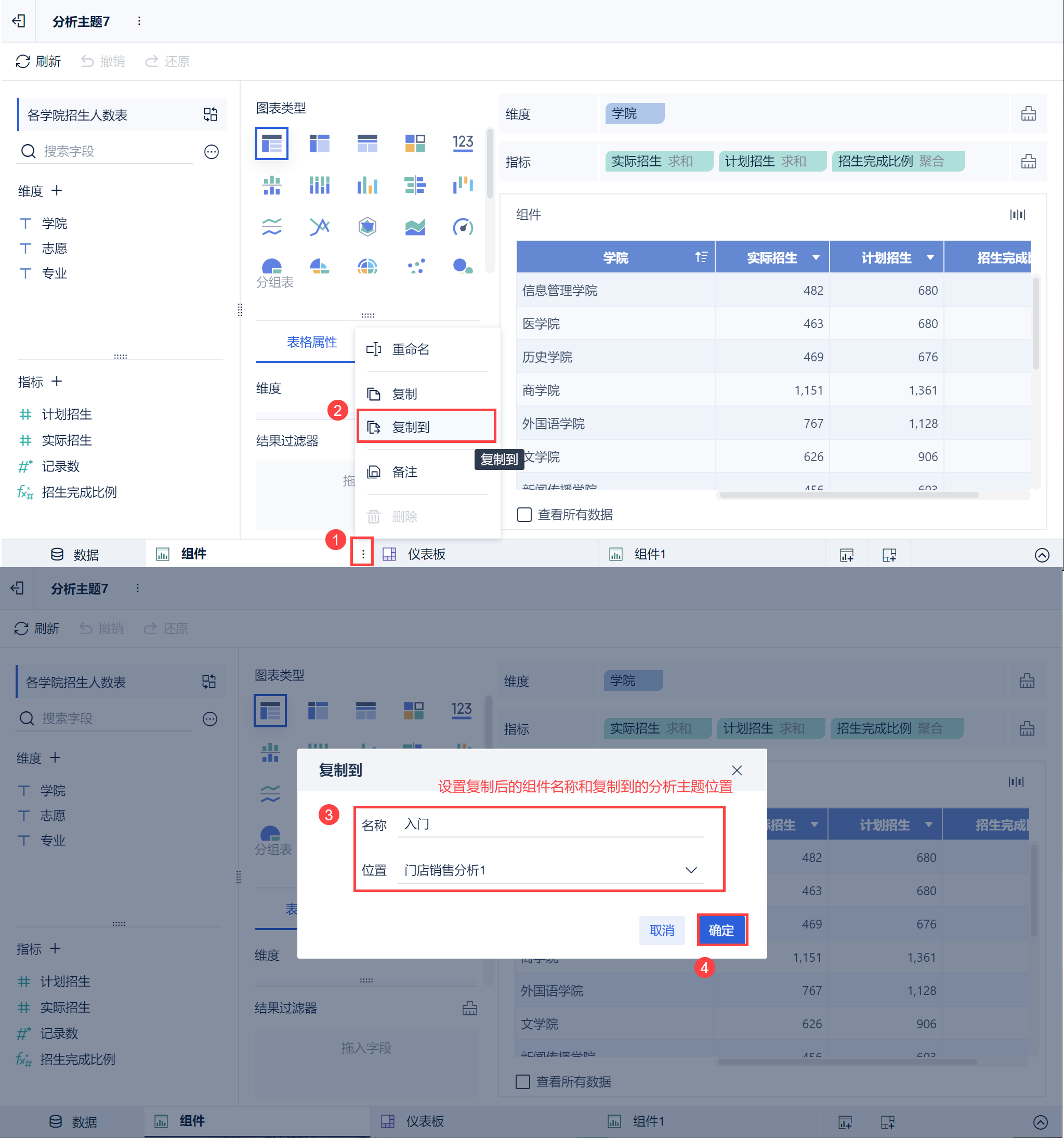 如果需要将组件复制到其他分析主题中,可以使用复制到功能,如下图所示: