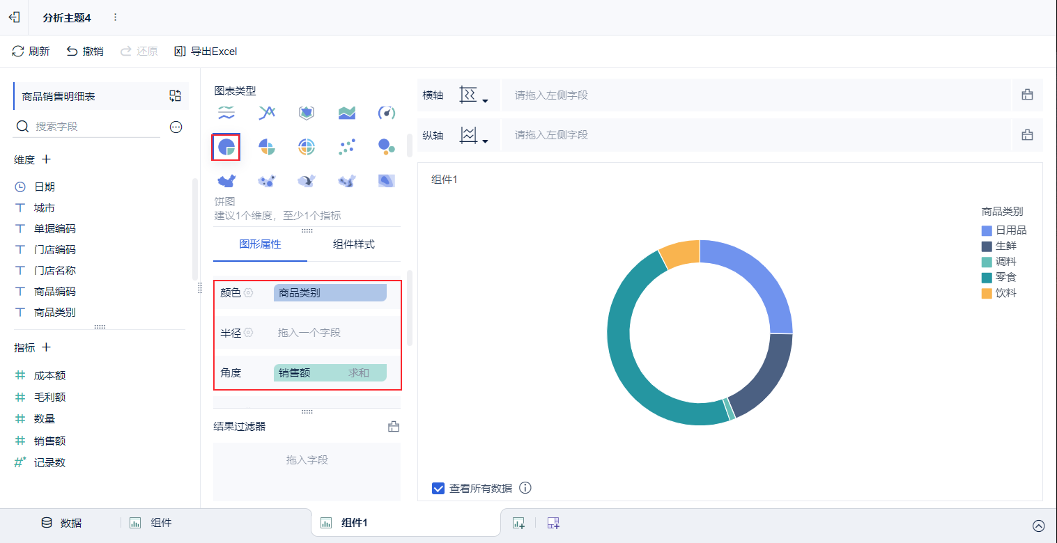 2)切换饼图。点击「饼图」切换图形,分析字段自动跳转到对应的位置:图形属性的颜色、角度框内。