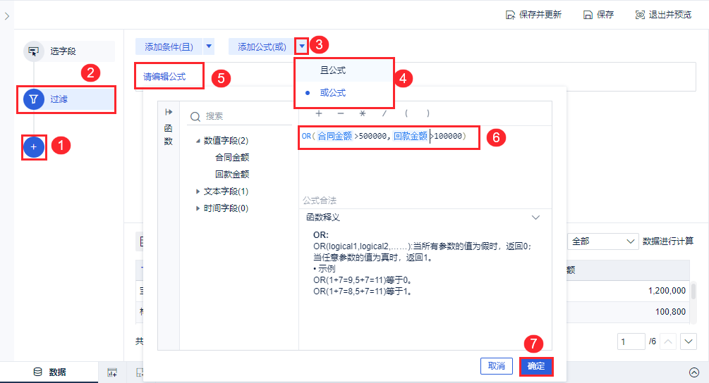 使用「过滤」操作。首先点击「+>过滤」,点击「添加公式」下拉按钮选择「或公式」,点击「请编辑公式」,在弹出的窗口中输入公式,公式为:OR(合同金额>500000,回款金额>100000),最后点击「确定」,则过滤出满足该条件的数据。如下图所示: