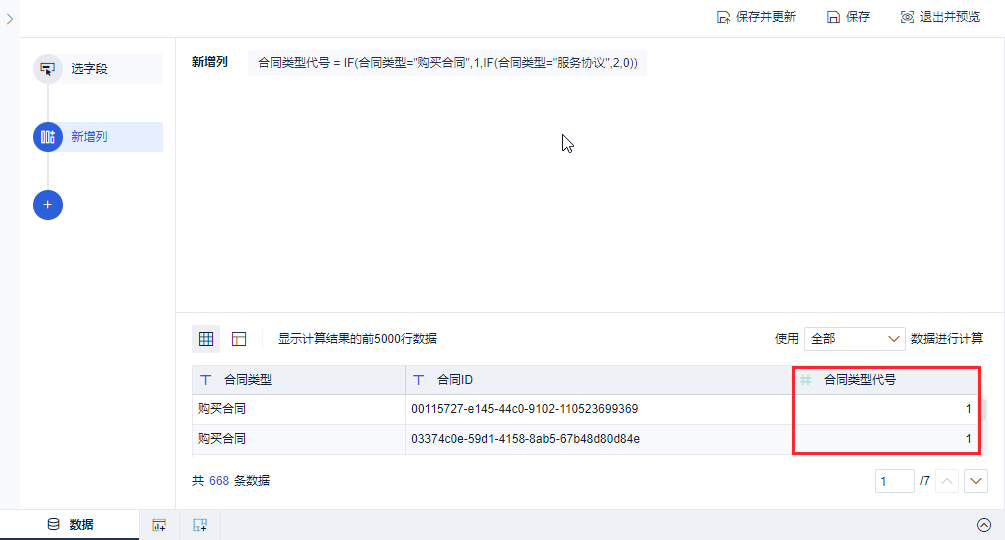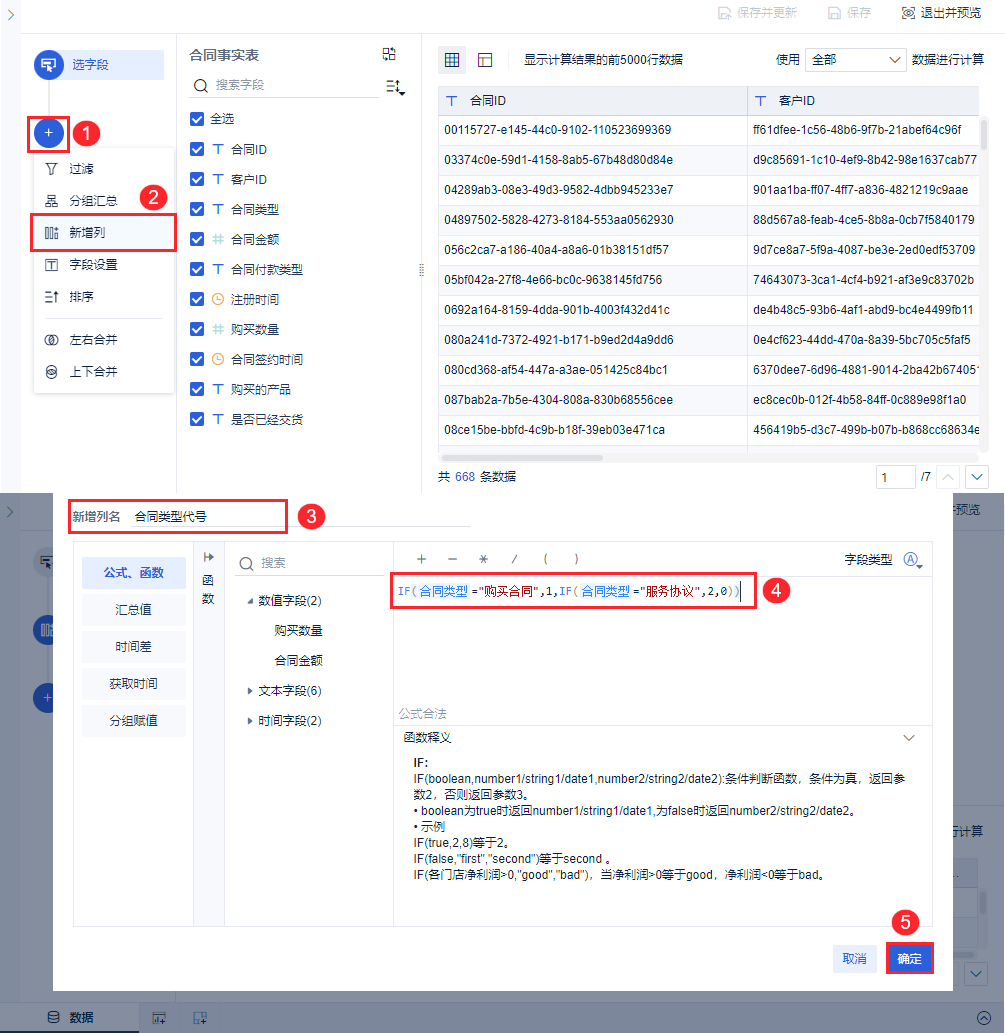 首先点击「+」选择「新增列 」,「新增列名」设为“合同类型代号”,命名后输入公式IF(合同类型="购买合同",1,IF(合同类型="服务协议",2,0)),最后点击「确定」,如下图所示: