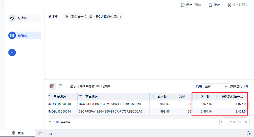 在自助数据集中使用 新增列 ,首先点击「+」选择「新增列」,「新增列名」设为“销售额保留一位小数”,命名后输入公式ROUND(销售额,1),点击「确定」,如下图所示: