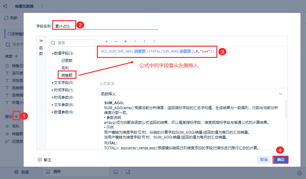 注:公式中累计总额和销售总额不能手动输入,需要点击数值字段的字段名。