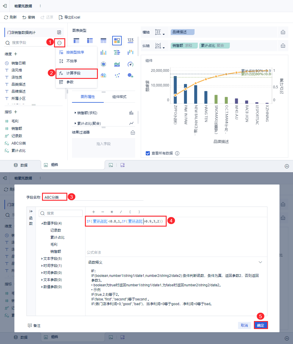 1)添加计算指标,命名为「 ABC 分类」,输入公式 IF(累计占比<0.8,1,IF(累计占比>0.9,3,2)) ,其中 1 代表 A 类商品,2 代表 B 类商品,3 代表 C 类商品。如下图所示: