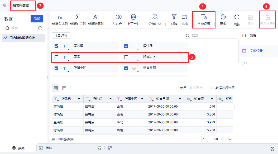 2)添加数据,点击「字段设置」取消勾选「店名」和「所属大区」字段,点击「保存并更新」,如下图所示: