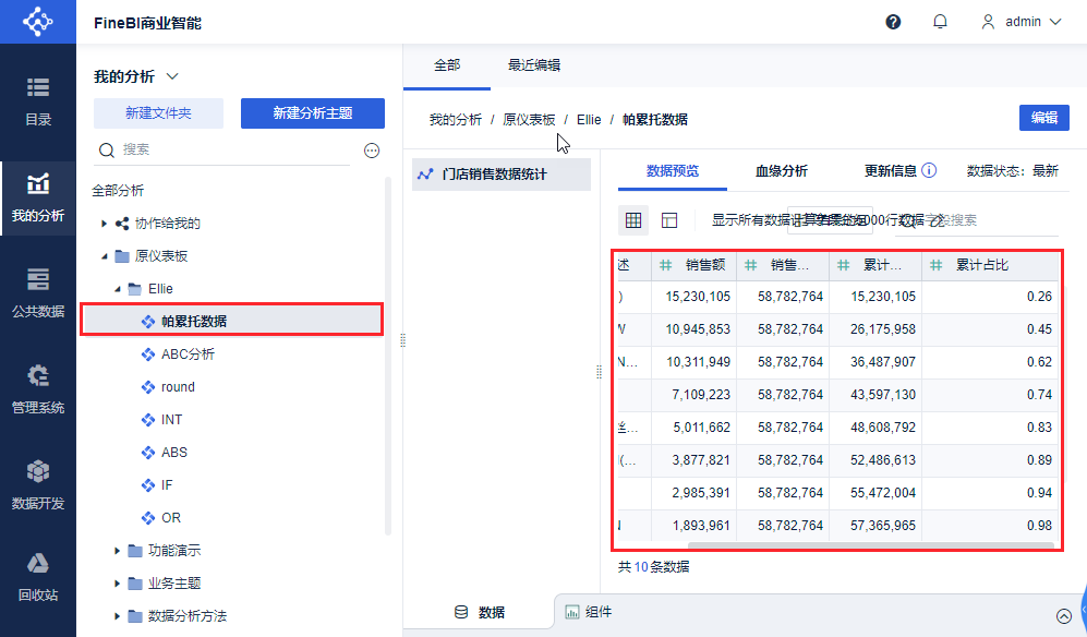 示例二:直接在主题数据中计算得出「累计占比」指标。得出的指标可方便在多个组件中反复使用。