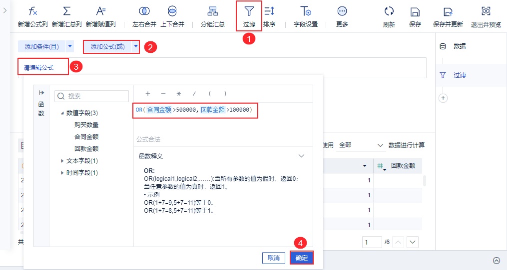 使用「过滤」操作。首先点击「过滤」,点击「添加公式」下拉按钮选择「或公式」,点击「请编辑公式」,在弹出的窗口中输入公式,公式为:OR(合同金额>500000,回款金额>100000),最后点击「确定」,则过滤出满足该条件的数据。如下图所示: