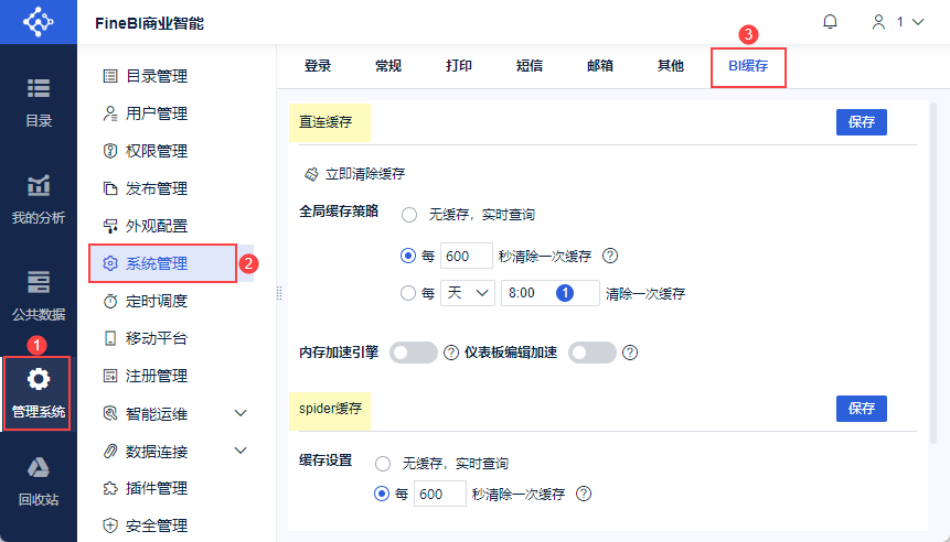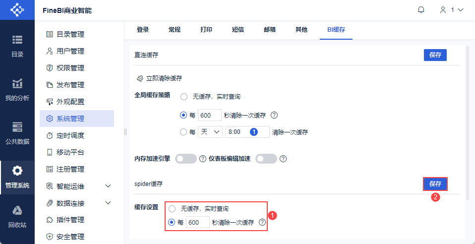 管理员登录FineBI系统,点击「管理系统>系统管理>缓存」,可进行「直连缓存」和「spider缓存」设置。