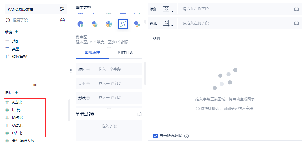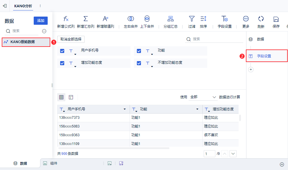1)创建分析主题「KANO分析」,添加「KANO原始数据」并点击「字段设置」勾选所有字段,如下图所示: