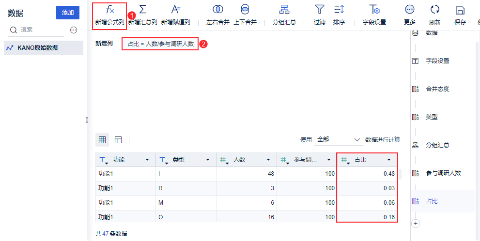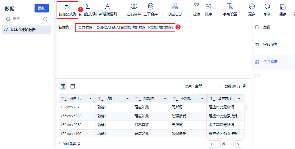 2)新增公式列列「合并态度」,将「增加功能态度」与「不增加功能态度」进行合并,如下图所示: