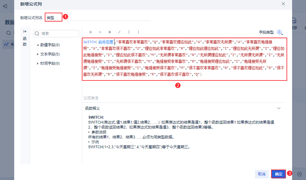 由于公式很长,用户可以直接复制下面到公式列,并用自己的字段替代「合并态度」,使用了 switch函数 :