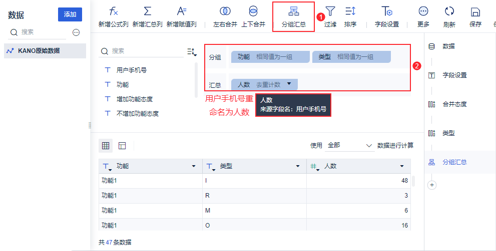 4)添加「分组汇总」,得到每个功能它们各种需求类型的人数,如下图所示: