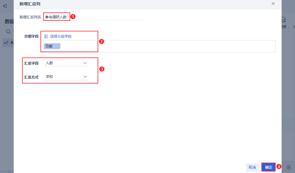 5)因为调研过程中有些用户会跳题,所以参与每个功能调研的人数有所不同。新增列「参与调研人数」,如下图所示,求出参与每个功能调研的人数。