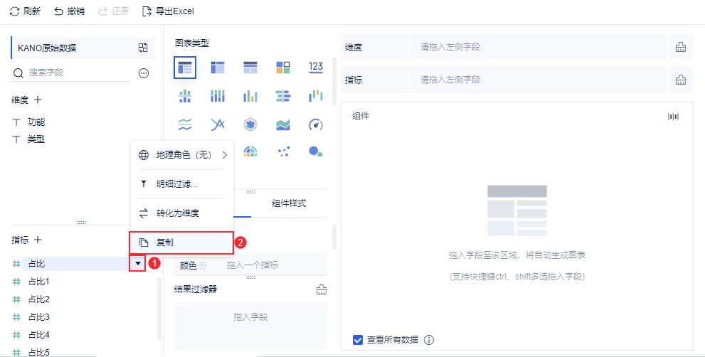 点击查看仪表板:KANO 模板 ,用户可以另存该仪表板后,查看学习仪表板内的详细操作。