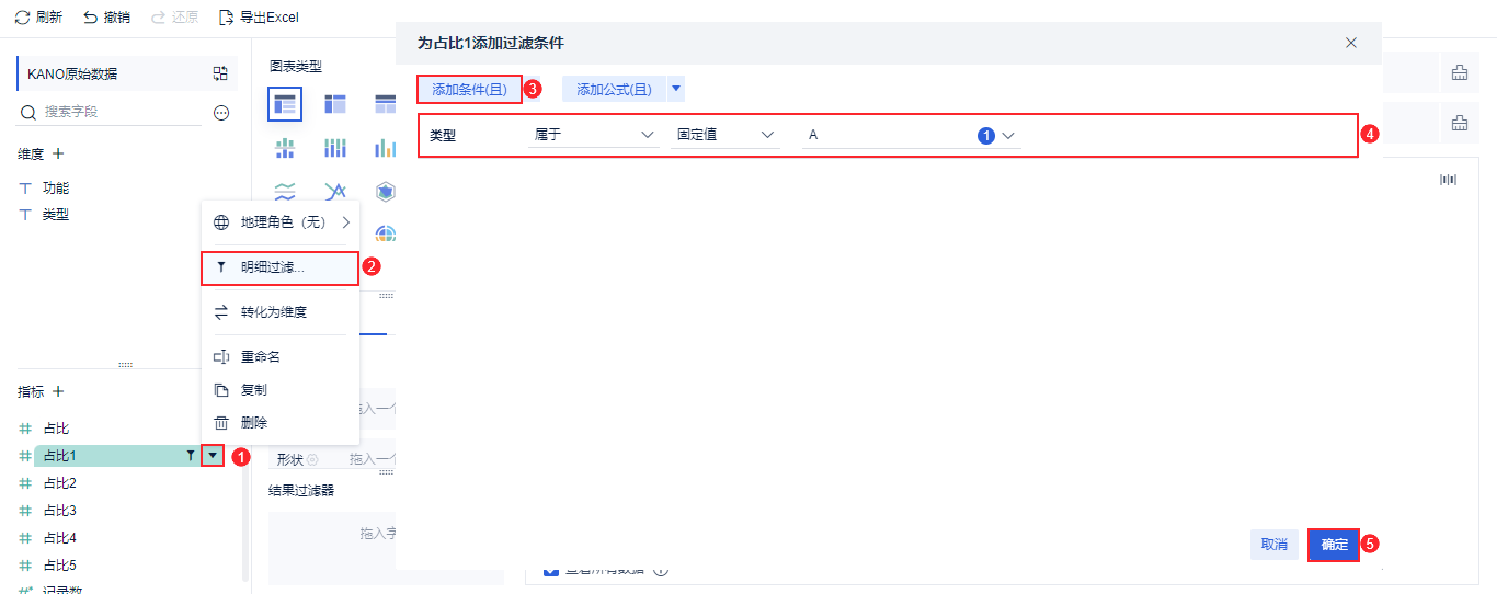 2)对复制的「占比」字段进行明细过滤,过滤条件为:类型属于 A 。并将其重命名为「A 占比」。如下图所示: