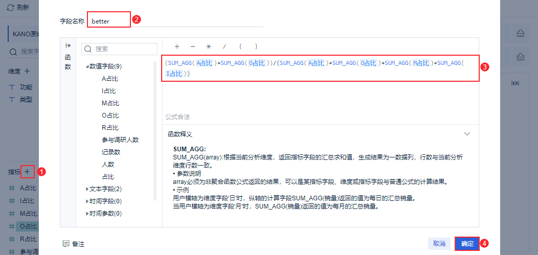 better-增加某功能后提升的满意系数:better=(A占比+O占比)/(A占比+O占比+M占比+I占比),越接近 1,则表示用户满意度提升的效果会越强,满意度上升的越快。