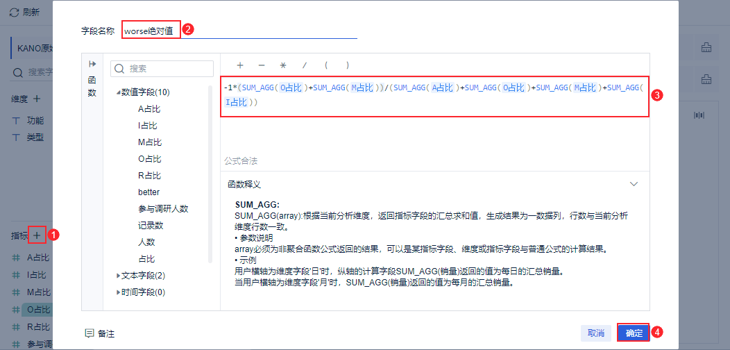 根据以上 better、worse 的公式,新建计算字段「better」「worse绝对值」,如下图所示: