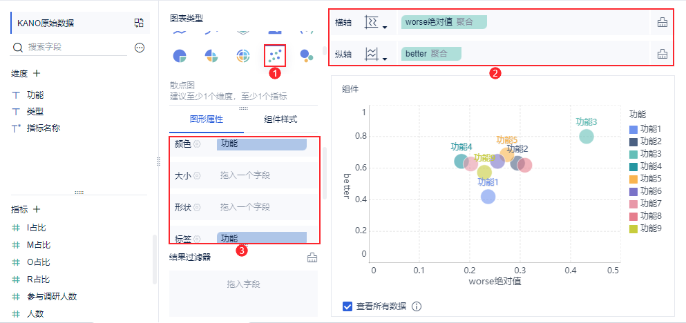 4)选择「散点图」,拖入「better」、「worse绝对值」字段。并将「功能」字段拖入图形属性的标签栏和颜色栏。如下图所示: