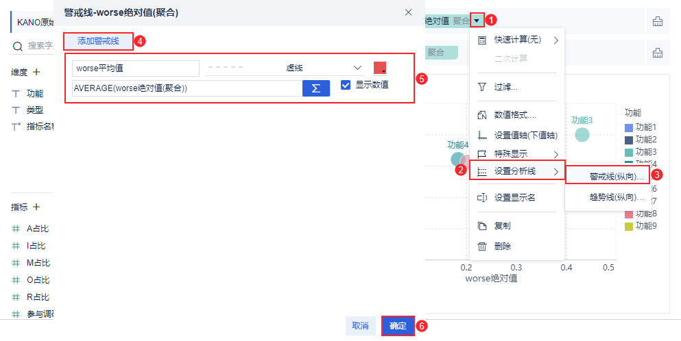 5)分别添加「横向警戒线」和「纵向警戒线」,分别为 better平均值 和 worse平均值 。如下图所示: