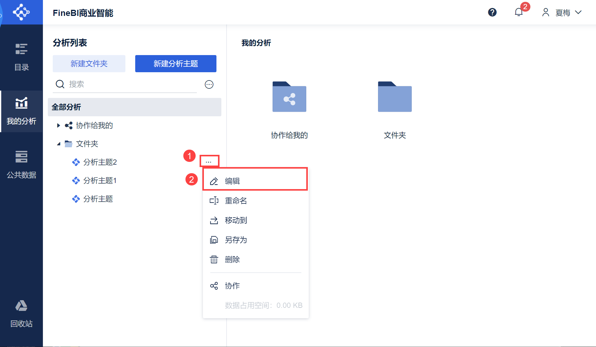 在我的分析右侧,点击「最近编辑」,可以看到最近编辑的一些分析主题,也包括别人协作给当前用户的分析主题,如下图所示: