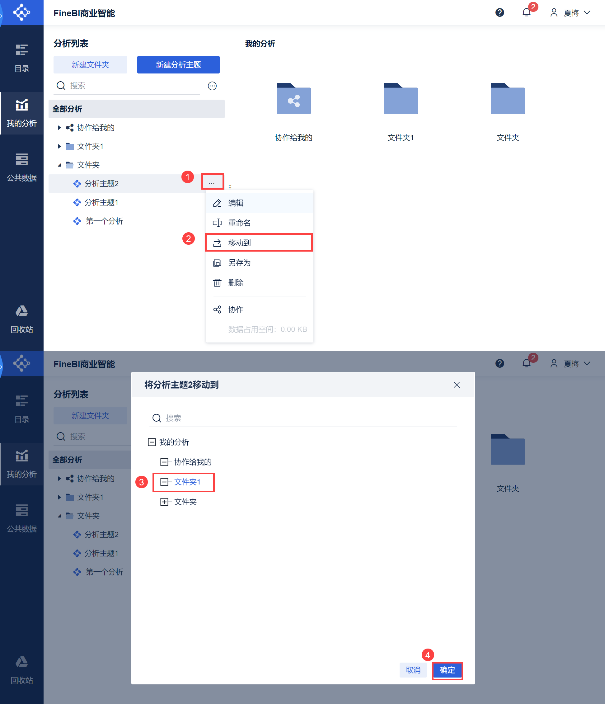 点击「...>移动到」,即可将分析主题移动到文件夹对应位置,点击「确定」,如下图所示: