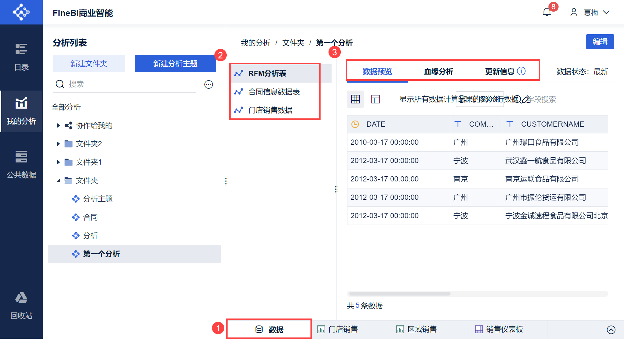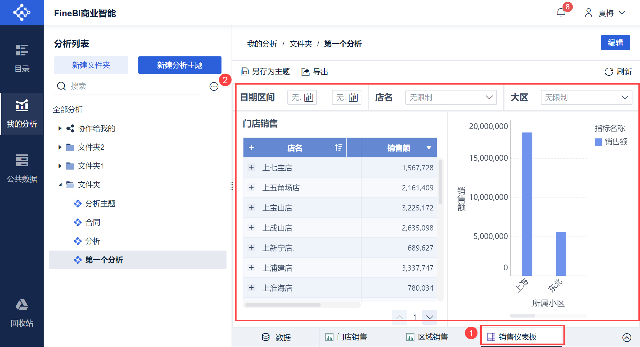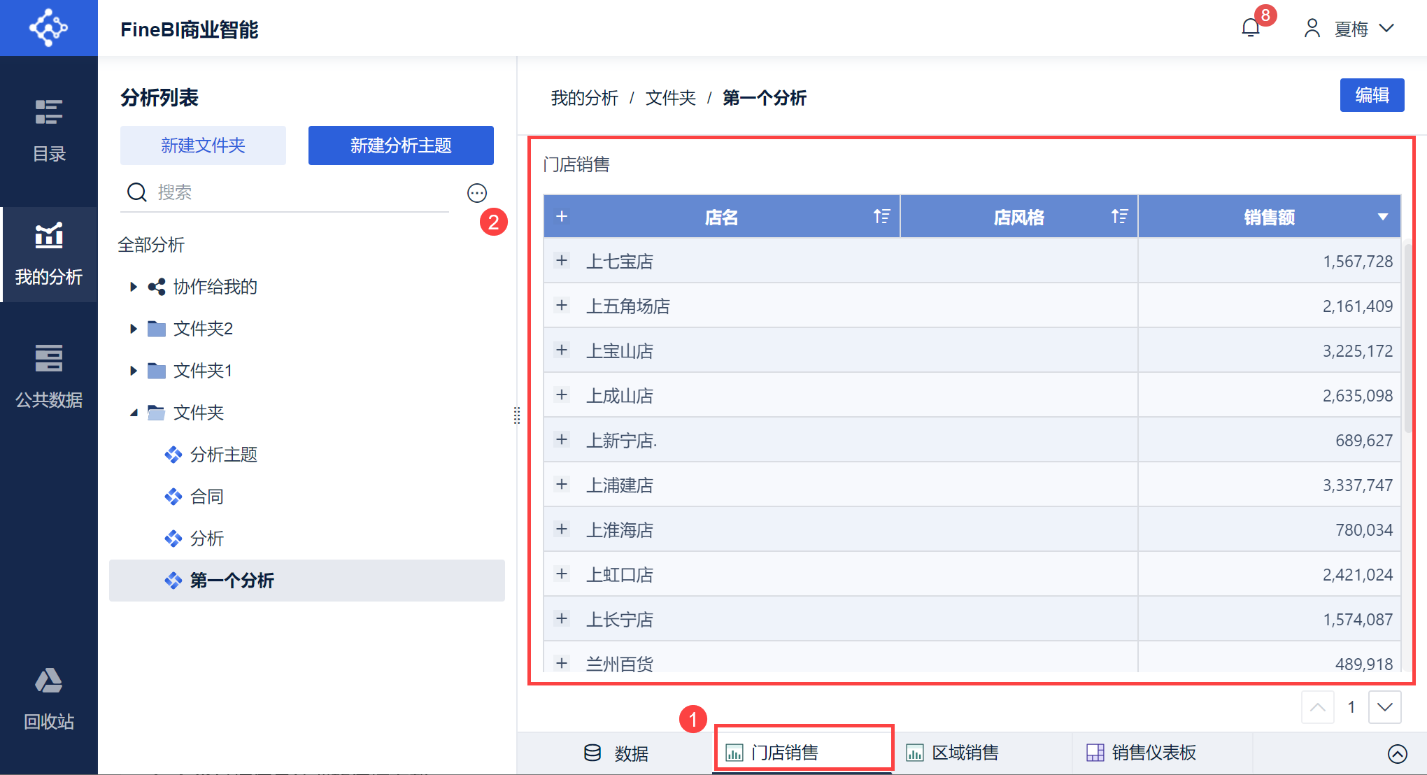 | A | 浅紫色区域。 「分析列表」存放着当前用户创建的和其他用户协作给该用户的所有分析主题 同时可以通过创建文件夹来管理分析主题 详情参见:管理我的分析 |