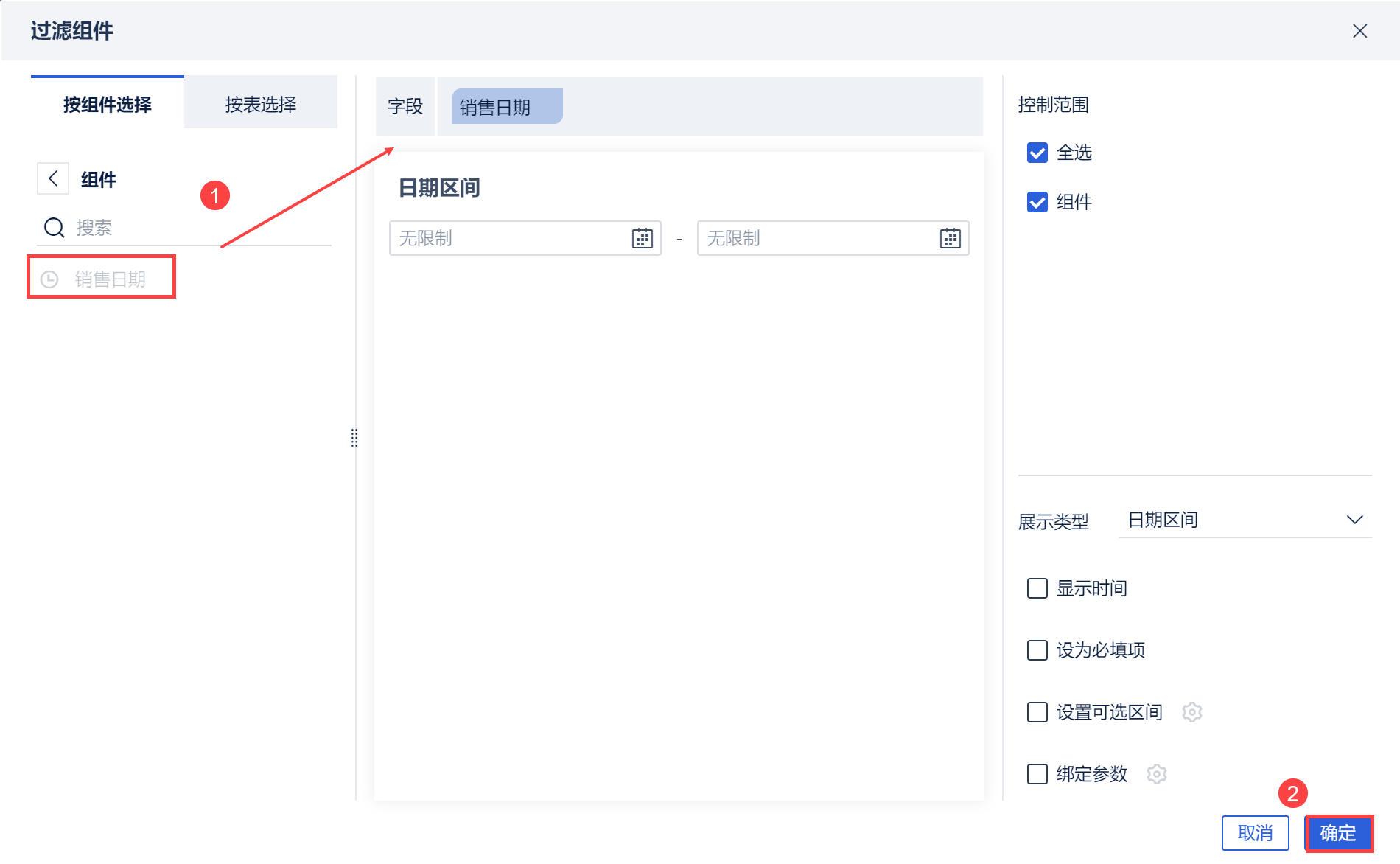 将「销售日期」字段拖入过滤组件中,如下图所示: